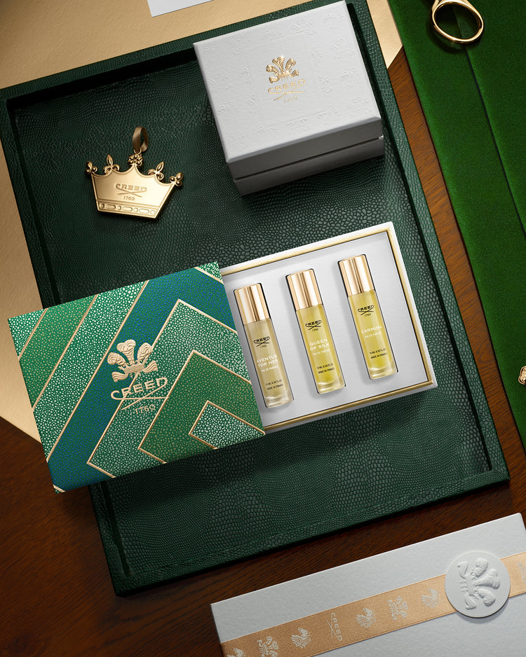Within the Women’s 3-Piece Gift Set lies a unique trilogy of treasures that reflect the mastery at the heart of The House of Creed. Invite that special someone to explore the woody freshness of Aventus For Her, the spirited sweetness of Carmina and the hypnotic floral allure of Queen of Silk.